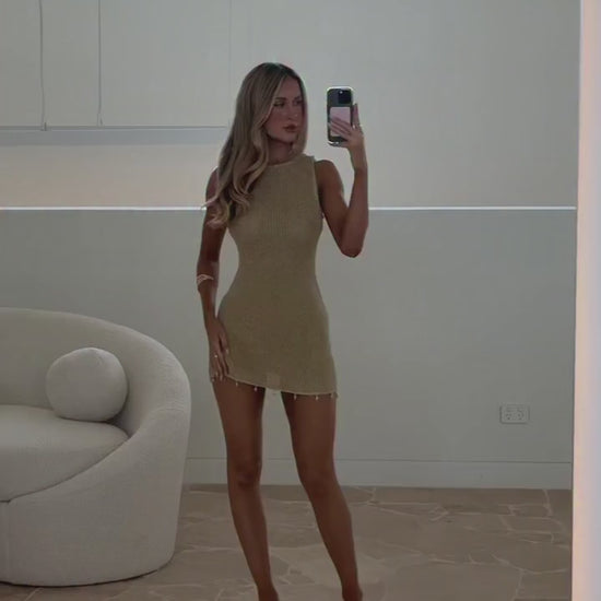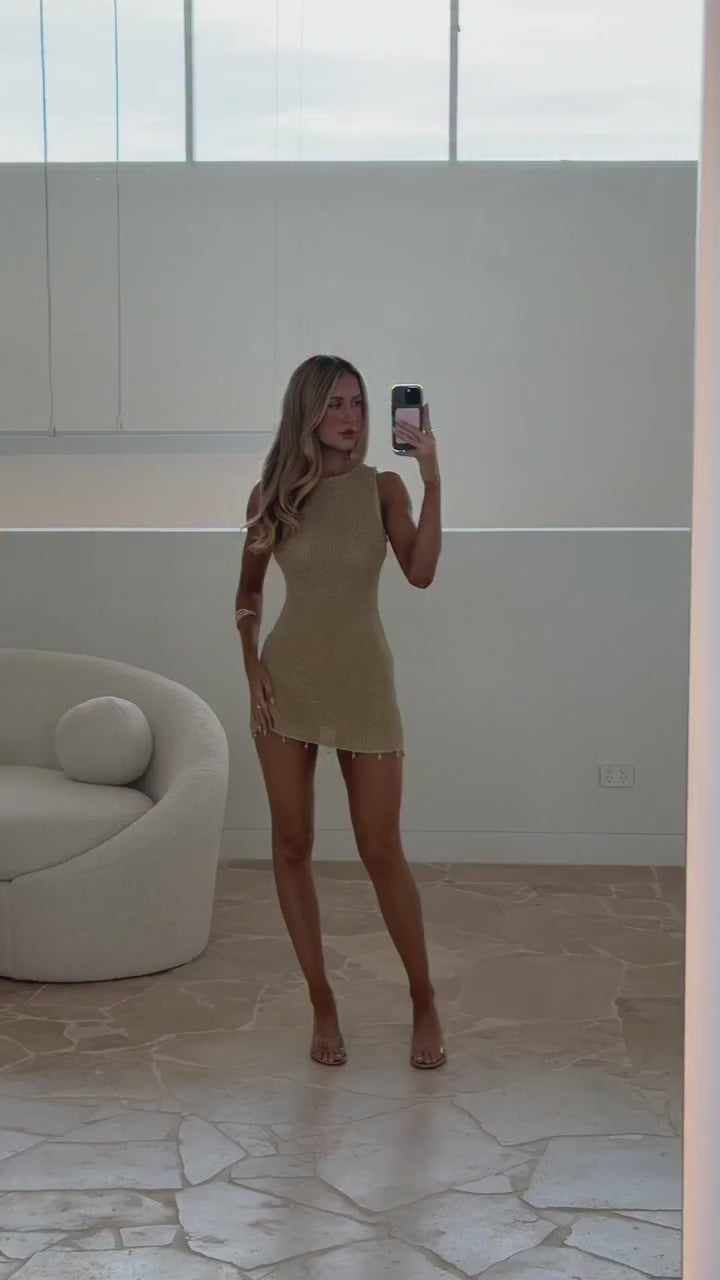 The Ariya Gold Knit Mini Dress is understated luxury with a sun-soaked edge. Crafted from a shimmering metallic knit, this body-skimming mini catches the light subtly while sculpting the silhouette.