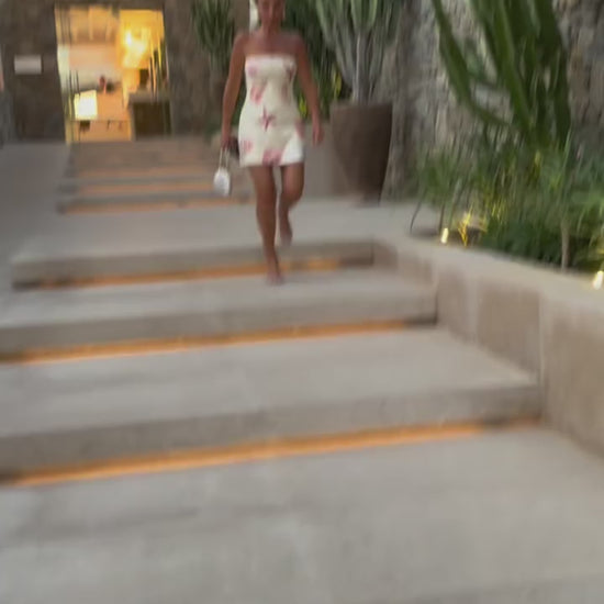 The Ibiza Sand Seashell Sequin Mini Dress by Runaway The Label is a standout summer occasion piece, spotted on Billie Shepherd in Mykonos. Designed with a sculpted strapless silhouette and delicate clear sequin overlay, this mini dress catches the light with subtle shimmer.