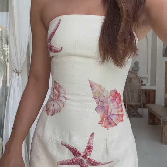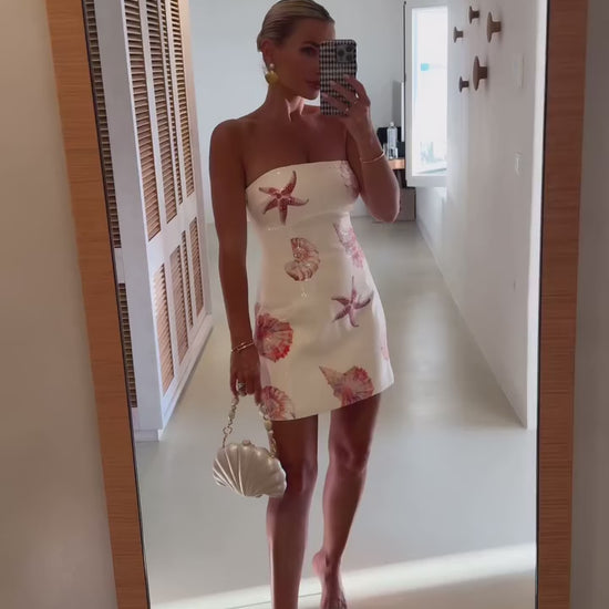 The seashell print and structured fit make it a strong choice for beach wedding guest dressing, destination evenings and coastal celebrations. Fully lined with internal gel tape for support, it holds its shape while maintaining a flattering profile.