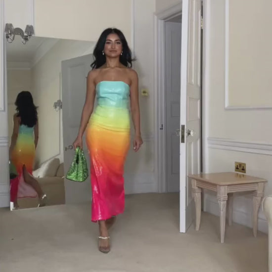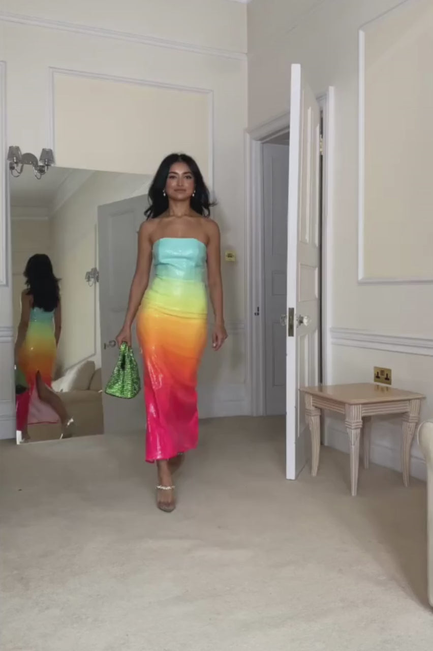 Designed to turn heads, the Malibu Ombre Sequin Midi Dress by Runaway The Label features a striking tropical ombré blend of aqua, sunshine yellow and hot pink. Finished with a straight strapless neckline and a fitted, body-skimming silhouette, this statement midi delivers confident glamour with a polished edge.